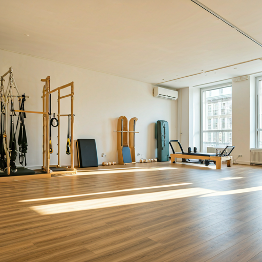 8대의 리포머/타워 콤보가 구비된 넓은 그룹 수업 공간